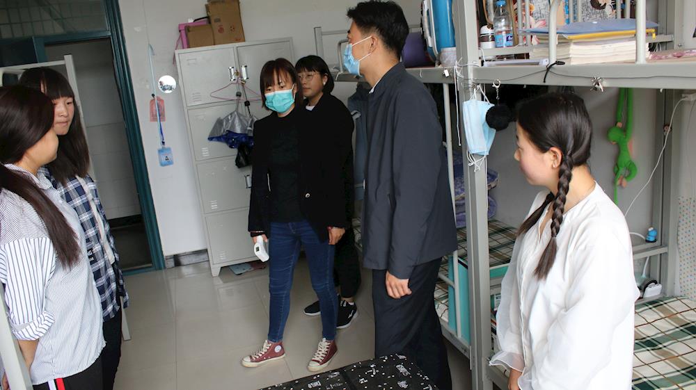 2020年5月14日,系学生返校安全小组成员在党总支书记张铎同志的带领下,对学生宿舍进行了走访,查看了学生宿舍卫生,详细询问了学生隔离期间的生活和上课情况,强调学生进一步做好安全防控工作,并对学生体温进行逐一测量登记,形成体温登记台账。